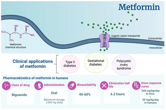 Overview of metformin chemical structure, clinical use, and pharmacokinetics. Chemically, metformin is a biguanide (1,1-dimethylbiguanide) used in the treatment/management of type 2 diabetes, gestational diabetes, and polycystic ovary syndrome. Metformin is administered orally in immediate- or extended-release form. Between 40–60% of metformin enters systemic circulation and is eliminated from the body in about 6.2 h. For pre-clinical studies in animal models, 250 mg/kg/day in mice corresponds to 20 mg/kg/day in humans [10,12]. Illustration created in BioRender.com.