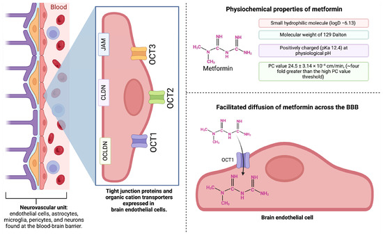 A proposed mechanism for the entry of metformin into the brain via the blood–brain barrier (BBB). The BBB is comprised of neurovascular units composed of brain endothelial cells, supporting cells (astrocytes, microglia, pericytes, and neurons), and tight junctional proteins. Endothelial cells of the neurovascular unit possess OCT1 transporters, which metformin can use to pass through the BBB. The physicochemical properties of metformin (small, hydrophilic, and positively charged molecule) suggest that metformin may use OCT for transporting across the BBB [83,84]. CLDN: claudins, OCLDN: occlusins, JAM: junction adhesion molecules, OCT: organic cation transporters, PC: permeability coefficient. Illustration created with BioRender.com.
