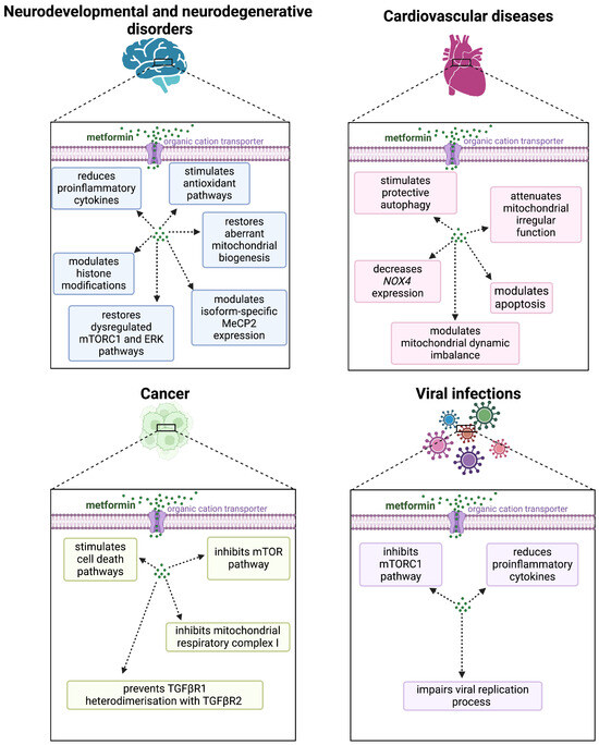 Summary of the potential effect of metformin in different human diseases. The pleiotropic effects of metformin are observed in the context of different diseases, including neurological and cardiovascular diseases, as well as in cancer and viral infection. Metformin may be a promising therapeutic agent in various diseases. Information obtained from: [18,40,46,47,48,49,50,51,52,59,61,65,91,93,94,95,109]. Illustration created in BioRender.com.