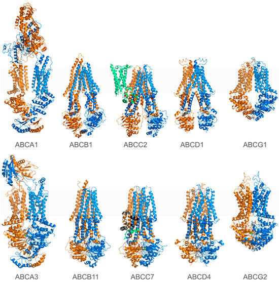 3D structures of human ABC transporters in inward-facing (top) and outward-facing (bottom) conformations. One representative member from the A, B, C, D, and G subfamilies is shown for each conformation. For the inward-facing state (top), the depicted transporters are ABCA1 (PDB: 7TDT), P-gp/ABCB1 (PDB: 6FN1), MRP2/ABCC2 (PDB: 8JY5), ABCD1 (PDB: 7VZB), and ABCG1 (PDB: 7R8D). For the outward-facing state (bottom), the transporters are ABCA3 (PDB: 7W02), BSEP/ABCB11 (PDB: 8PMD), CFTR/ABCC7 (PDB: 6O2P), ABCD4 (PDB: 6JBJ), and BCRP/ABCG2 (PDB: 6HBU). Transmembrane domain 1 (TMD1) and transmembrane domain 2 (TMD2) are represented in orange and blue, respectively. TMD0, specific to the C subfamily, is shown in green. For CFTR, the N-terminal lasso and the R domain are shown in black and green, respectively.