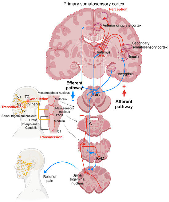 - Donertas-Ayaz, B.; Caudle, R.M. Locus Coeruleus-Noradrenergic Modulation of Trigeminal Pain: Implications for Trigeminal Neuralgia and Psychiatric Comorbidities. Neurobiol. Pain 2023, 13, 100124. [Google Scholar] [CrossRef]