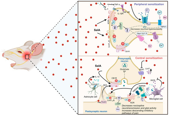 | Jamshidi et al., 2015 [153] | Prostaglandin E2 (PGE2)-induced thermal allodynia | Male Sprague Dawley rats | 0.1 µg i.pl. | SalA increased the paw withdrawal latency in the radiant heat stimulus, which was interpreted as an anti-allodynic effect; then, it was able to increase the activity of c-Jun N-terminal kinase (JNK) and inhibit cyclic adenosine monophosphate (cAMP) in primary sensory neuron cultures. |