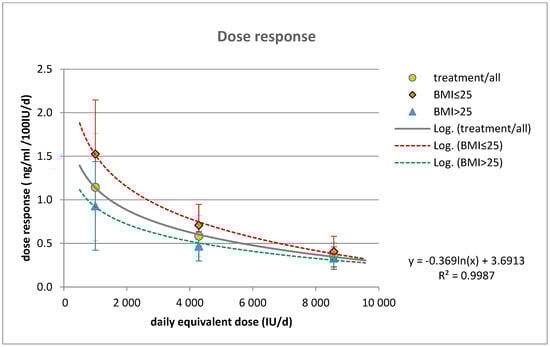 In addition to observed changes in mean 25(OH)D, the loading effectiveness is depicted by individual plots. The impact of BMI on treatment effectiveness was analyzed here using a simplified linear regression model, which showed a consistent deficit in effectiveness for overweight–obese subjects within the therapeutic range of 1000–10,000 IU/d. (Figure 3).
