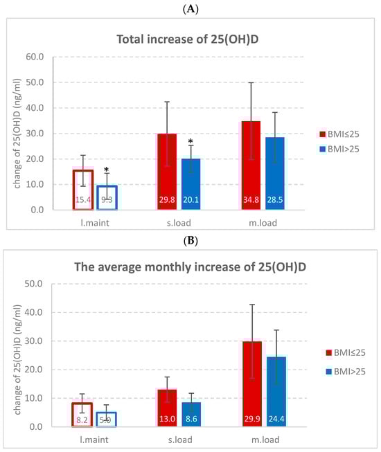 On the chart where the effectiveness was plotted by the average monthly increase (normalized for 30 days) of the treatment (Figure 2B), the difference for the 1000 IU/die low-dose maintenance was 5.0–8.3 ng/mL for the “BMI > 25” vs. the “BMI ≤ 25” subjects, compared to increase in slower loading (8.6–13.0 ng/mL) in a similar range. Rapid repletion by the moderate–faster-loading results in a prominent increase in 25(OH)D for both the high and the low BMI subgroups.