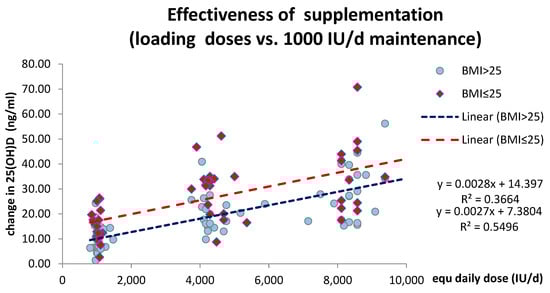 It has been concluded that BMI is a useful predictor for dose–response evaluations. In accordance with the recommendations of the Endocrine Society [], supplementation should be 1.5 to 3 times higher for overweight or obese individuals compared to normal-weight subjects []. Our results, based on a simplified linear model, suggest that the adjusted daily dose equivalent (DDE) for overweight–obese patients can be calculated as follows: DDE = 1.037 × X(dose in IU) + 2600 (IU) for the loading doses.