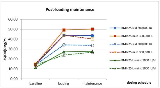 The risk of overload as a result of delayed effects of loading, in addition to maintenance doses, was maybe due to delays in transport, distribution, and metabolism of the physiological cholecalciferol conversion process. Orally ingested vitamin D travels with chylomicrons and lipoproteins, allowing for receptor-mediated, rapid hepatic delivery of vitamin D. However, it is also stored mainly in the adipose tissue as cholecalciferol [,] serving as a buffer for hepatic access, which could result in the superimposed production of calcidiol. Individual or altered balance between production and clearance may also contribute to a consequent rise in 25(OH)D levels. A pharmacokinetic study reported by Ilahi et al. demonstrated a rapid increase in circulating 25(OH)D levels during the first 1–2 days, followed by a delayed increase that reaches the maximum around 7–10 days after ingestion, and then a gradual descent over the next 20–50 days []. Similarly, another study with an intermittent administration of 50,000 IU/month doses, resulted in a delay of the increase in 25(OH)D at least by 25 days after the last dose administered, in younger participants with vitamin D deficiency and low BMI []. The dosing schedule we used for loading treatment arms is essentially in the similar range, attributed to a potential superimposed 25(OH)D conversion, as the physiological decline of 25(OH)D after reaching the peak is longer than the interval before the next dose is taken. The observed delays in loading reconciliation cannot be fully explained by the differences in BMI of these patients (average BMI among these subjects was 25.9 ± 5.2 kg/m2).
