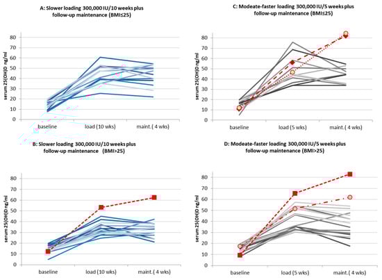 Serum 25(OH)D levels during the post-loading follow-up maintenance period by the subgroups of BMI resulted in reconciliation to steady 25(OH)D levels within the target zone. Dotted lines with open symbols indicated the subgroups of BMI > 25 patients. The two dosing schedules of loading (5 and 10 weeks) with a total dose of 300,000 IU continued with 4 weeks of the same 2000 IU/die equivalent follow-up maintenance and were compared to low-dose maintenance therapy with a continuous 1000 IU/die served as an active control (n = 62).