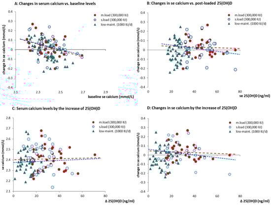 (A–D) Changes in serum calcium from baseline to post-treatment: (A,B) Changes in serum calcium by the initial calcium levels and by the post-loaded 25(OH)D levels. (C,D) Post-loaded serum calcium levels and the changes in serum calcium by the increase in Δ25(OH)D of treatment. There was no statistical correlation found between 25(OH)D and changes in serum calcium. (The trendlines, although statistically not supported, added as dashed-red lines and -blue for m.loading and s.loading, respectively. Green triangles represent the individuals of low-dose maintenance).