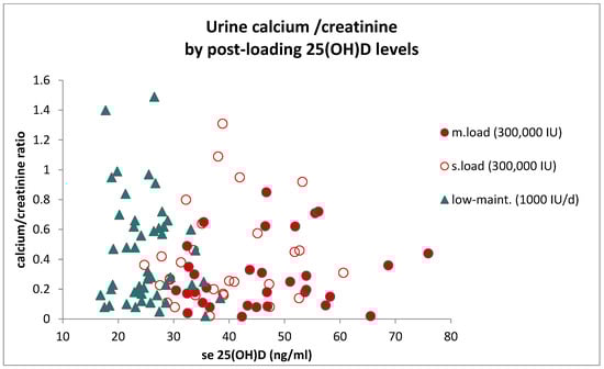 Individual data points of the slower-loaded and moderate–faster-loaded subsets represented no significant association resulting in increments of CA/CRE within the 20–80 ng/mL range of 25(OH)D, which suggests that no relevant risk of hypercalciuria is associated with increased vitamin D levels as the effect of loading.