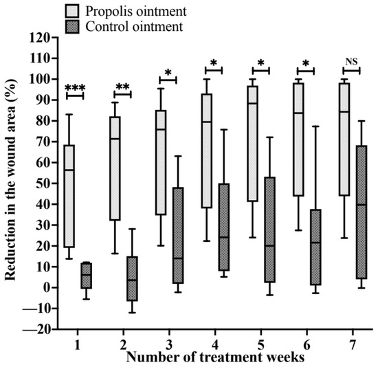 Reduction in the wound area (%) during the weeks of treatment. The wound area was measured weekly using the tracing technique, followed by morphometric analysis, allowing detailed monitoring of the evolution of the lesion throughout the treatment. The data reveal a decrease in the wound area in both groups: the group that received propolis (G1) and the control group (G2) throughout the intervention period. It is observed that, in G1, the reduction was significantly more pronounced compared to that in G2 until the sixth week of treatment, with a particularly high percentage of reduction in the first two weeks, indicating a more effective therapeutic response in the initial phase of treatment. NS = no statistical significance. *, significant at the 0.05 level; **, significant at the 0.01 level; ***, significant at the 0.001 level. The exact p-values according to the number of treatment weeks were <0.001 (week 1), 0.002 (week 2), 0.022 (week 3), 0.022 (week 4), 0.014 (week 5), 0.022 (week 6), and 0.051 (week 7).