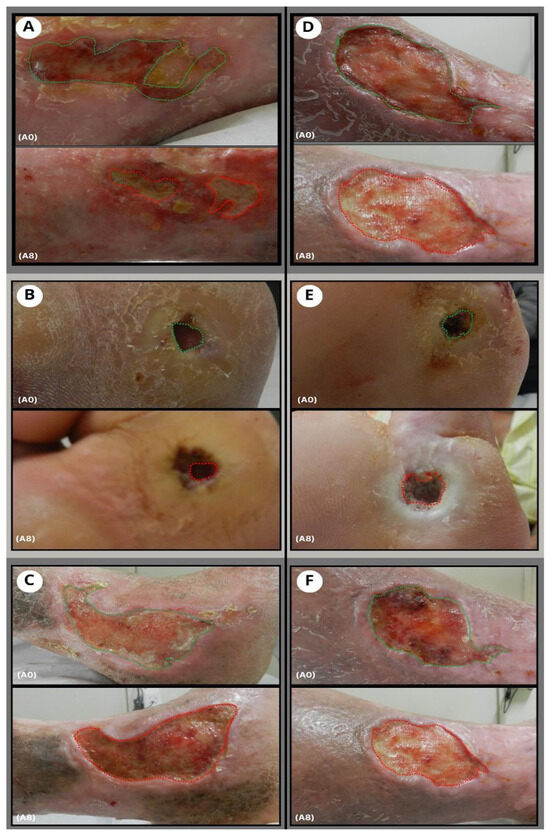 Morphometry of ulcers. Images (A–C) are wounds belonging to G1 (on the left); (D–F) are wounds belonging to G2 (on the right); The morphometric analysis was performed using the edges of the wounds as a reference to measure the total area. The green dashed lines indicate the edges of the lesions in the initial assessment (A0), while the red dashed lines indicate the edges of the lesions in the final assessment (A8). Macroscopically, a more pronounced reduction in the lesion area is observed in G1 compared to G2. Furthermore, there is an improvement in the revitalization of the affected tissue and adjacent tissues, which contributes to tissue repair. Measuring the area and tissue vitality are components used in the PUSH scale to assess the evolution of the clinical condition.