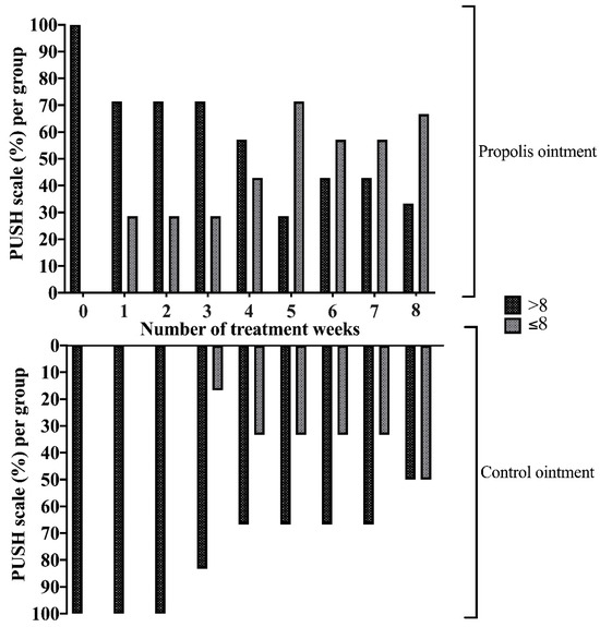 PUSH scale average (%) during the weeks of treatment. The figure represents the data considering a cut-off of eight points on the PUSH scale. Note that the percentage of high scores (>8) gradually decreased with continued treatment in both groups. Also note that in G1 (propolis ointment), this decrease occurred from the beginning of treatment, while in G2 (control ointment), this reduction began only after the third week of treatment. Also, in week 5, 71.4% of G1 wounds versus 33.3% of G2 wounds were scored at less than eight points (<8). In the final week, 66.7% of G1 wounds versus 50% of G2 wounds presented a low score. The drop in the score reflects the reduction in the dimensions of the lesion (length and width), as well as the reduction in the amount of exudate and the improvement in tissue quality.