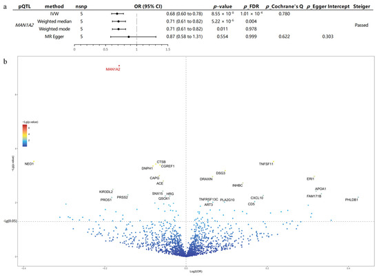 (a) Forest plot displaying the positive findings from MR analysis. MAN1A2 exhibits a significant causal association (p_FDR < 0.05, p_Cochrane’s Q > 0.05 and p_Egger Intercept > 0.05) with RLS outcome. According to IVW, MAN1A2 was identified to mitigate the risk of RLS and exhibited a significant MR result (OR = 0.68 [0.60,0.78], FDR = 1.01 × 10−4). (b) Volcano plots of the MR results between plasma proteins and RLS. The x-axis represents the log2 odds ratio (log2(OR)) of the causal effect of each protein, while the y-axis shows the negative logarithm of the p-value (−Lg(p-value)) for each association. The dashed horizontal line indicates the significance threshold (p = 0.05). The color gradient represents the level of significance, with warmer colors indicating stronger associations. The p-value of MAN1A2 is significantly lower than other proteins. All plasma proteins with p-value < 0.01, p_Cochrane’s Q > 0.05, and p_Egger Intercept > 0.05 were labeled; however, only MAN1A2 still showed significant association with RLS after FDR correction. FDR, False discovery rate; p_FDR, p-value after FDR correction; p_Cochrane’s Q, p-value from Cochrane’s Q test; p_Egger Intercept, p-value from MR Egger analysis; OR, odds ratio.