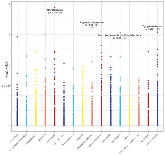 Manhattan plot displaying MR-PheWAS findings. This plot illustrates the associations between MAN1A2 (from UKB-PPP) and 2407 phenotypes (from FinnGen) grouped into major biological categories. The x-axis represents phenotype categories, while the y-axis shows the negative logarithm of the p-values (−Lg(p-value)) for each association. The dashed horizontal line indicates the significance threshold (−log10(0.05)). MAN1A2 was not significantly related to the phenotypes after FDR correction. Four diseases with p-value < 0.0001 were labeled, but the relationship does not appear to be significant after FDR correction.