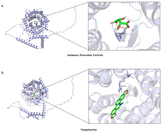 Molecular docking results of MAN1A2 and predicted drugs. (a) the interaction between MAN1A2 and antimony potassium tartrate; (b) the interaction between MAN1A2 and sanguinarine. The blue ribbons represent the three-dimensional structure of the MAN1A2 protein. The green sticks represent the predicted drugs. The red portions of the ligands represent oxygen-containing groups, the blue portions represent nitrogen-containing groups, and the white portions represent hydrogen atoms. The yellow dotted lines indicate potential hydrogen bonds between MAN1A2 and the corresponding drugs. The labeled residues (e.g., THR-619 and ARG-531) are the key amino acid residues of MAN1A2 that interact with the drugs, and the numbers (e.g., 2.5, 1.8) represent the hydrogen bond lengths in angstroms.