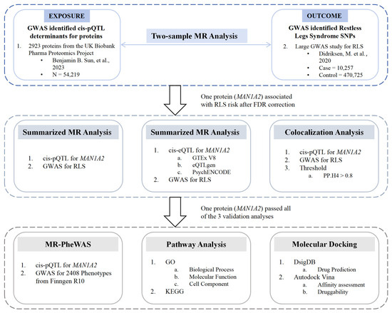 We thank the UK Biobank, deCODE, Yang Lab, and FinnGen for sharing data and tools. The SMR tool was downloaded from “https://yanglab.westlake.edu.cn/software/smr” (accessed on 10 December 2023). GWAS data for RLS were downloaded from “https://www.decode.com/summarydata/” (accessed on 6 December 2023). We really appreciate Sun et al. [24] for sharing UKB-PPP GWAS summary data on “https://metabolomips.org/ukbbpgwas/” (accessed on 6 December 2023). The raw UKB-PPP data can be obtained through an interactive portal (“http://ukb-ppp.gwas.eu”, accessed on 3 December 2023). UKB has cataloged the dataset in Category 1839, under ‘Field 30900’, described in greater detail online (“https://biobank.ndph.ox.ac.uk/showcase/label.cgi?id=1839”, accessed on 3 December 2023). GTEx v8 related data were downloaded from “https://gtexportal.org/home/” (accessed on 25 December 2023). Data from the 1000 Genomes Project were downloaded from “https://www.broadinstitute.org/” (accessed on 4 December 2023). The whole-blood eQTL data were downloaded from “https://eqtlgen.org” (accessed on 24 December 2023). The PheWAS phenotype data were obtained from “https://r10.finngen.fi” (accessed on 10 January 2024). All of the data generated during this study are included in this article and its Supplementary Materials files.