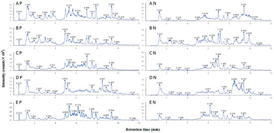 UHPLC–MS/MS ion spectra of ethanol extracts of bee pollens: A, B, C, D, and E represent rapeseed, apricot, camellia, lotus, and sunflower bee pollens, respectively. P and N represent positive ion mode and negative ion mode, respectively.