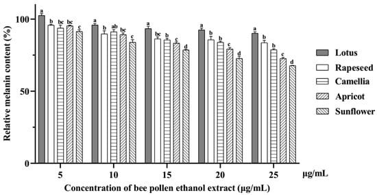 The relative melanin content in B16F10 cells treated with ethanol extracts of bee pollens. Note: Different lowercase characters above the same concentration mean significant differences (p < 0.05).