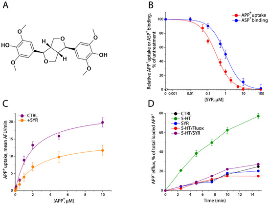 SYR noncompetitively inhibited SERT activity. (A) The structure of SYR. SYR holds a two-fold symmetrical structure with two 2,6-dimethoxyphenyl groups located at both sides. (B) SYR inhibition of both APP+ uptake and ASP+ binding by hSERT. The cells stably expressing hSERT were used for measuring APP+ uptake or ASP+ binding activity without or with SYR treatment at the indicated concentrations, as described in Section 4. The graph shows APP+ uptake or ASP+ binding activity relative to that measured in the absence of SYR. IC50 values for SYR inhibition of APP+ uptake or ASP+ binding were 0.25 ± 0.01 μM or 0.96 ± 0.02 μM, respectively. These IC50 values represent the mean ± SEM from multiple experiments (n ≥ 3). (C) Noncompetitive inhibition of APP+ uptake by SYR. APP+ uptake was measured with or without the addition of 0.25 μM SYR. Km and Vmax values represent the mean ± SEM from multiple experiments (n ≥ 3). (D) Time course of APP+ efflux under various treatments. The cells preloaded with APP+ were incubated with KRH buffer in the absence or presence of 5-HT (10 μM), SYR (10 μM), 5-HT + fluoxetine (10 μM + 10 μM), or 5-HT + SYR (10 μM + 10 μM), at 22 °C for the indicated time periods. After 3× rapid washing, the APP+ fluorescence retained in the cells was measured. The graph shows APP+ efflux expressed as a percentage of total preloaded APP+ fluorescence. The experiment was repeated two more times with similar results. CTRL, control; Fluox, fluoxetine.