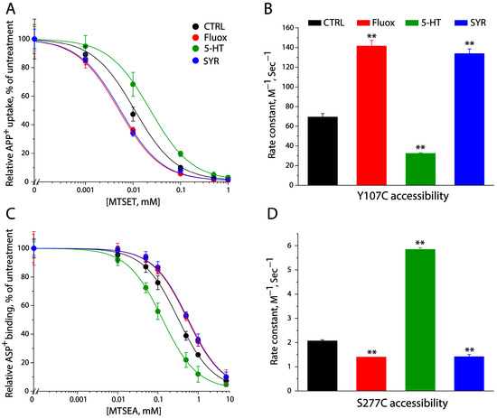 SYR stabilized an outward-open and inward-closed conformation of SERT. (A) MTSET concentration-dependent inhibition of APP+ uptake under various treatments. The inhibition of APP+ uptake by MTSET over a range of concentrations (0–1 mM) was measured in the cells stably expressing Y107C/C109A with or without the addition of 10 μM fluoxetine (Fluox), 5-HT, or SYR. The graph shows APP+ uptake relative to that in the absence of both MTSET and ligand. (B) Rate constants for MTSET reactivity with Y107C/C109A. Error bars represent SEM from multiple experiments (n ≥ 3). ** p < 0.01 compared with the rate constant in the control (MTSET alone). (C) MTSEA concentration-dependent inhibition of ASP+ binding under various treatments. Inhibition of ASP+ binding by MTSEA at the indicated concentrations was measured in digitonin-permeabilized cells stably expressing S277C/X5C with or without the addition of 10 μM fluoxetine (Fluox), 5-HT, or SYR. (D) Rate constants for MTSEA reactivity with S277C/X5C. Error bars represent SEM from multiple experiments (n ≥ 3). ** p < 0.01 compared with the rate constant in the control.