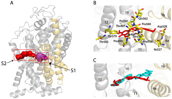 To reveal the molecular basis for SYR inhibition, we conducted molecular docking of SYR on the hSERT structure in an outward-open conformation [26]. As shown in Figure 4A,B, SYR adopts an extended conformation in an allosteric site (S2) where the SYR molecule is coordinated by the residues in several transmembrane (TM) α-helices, including Gln111 in TM1b; Ile327 and Asp328 in TM6a; Glu493, Glu494, Thr497, Gly498, and Pro499 in TM10; Phe556, Ser559, Pro560, Pro561, Gln562, Leu563, Arg564, and Leu565 in TM11; and Tyr579 and Thr583 in TM12, of which Asp328 forms an H-bond with a hydroxyl group in one 2,6-dimethoxyphenyl moiety of SYR. Another 2,6-dimethoxyphenyl moiety stretches toward TM12, interacting with the side chains of Tyr579 and Thr583. The hexahydrofurfural group is surrounded by the side chains of residues Pro499, Phe556, Pro560, and Pro561, which form an aromatic pocket in the S2 site [25].