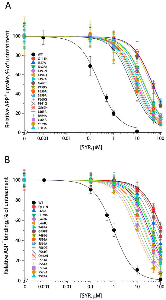SYR inhibition of APP+ transport (A) or ASP+ binding (B) by hSERT and its S2 site mutants. APP+ transport or ASP+ binding by WT-hSERT or its allosteric S2 mutants was measured over the indicated range of SYR concentrations as described in Section 4. Nonspecific APP+ transport or ASP+ binding was measured by adding 100 μM fluoxetine. The graph shows SYR inhibition of APP+ transport or ASP+ binding by hSERT and its S2 mutants relative to that measured without SYR addition. IC50 values calculated from nonlinear regression analyses were shown as the mean ± SEM from at least three experiments in Table 1.
