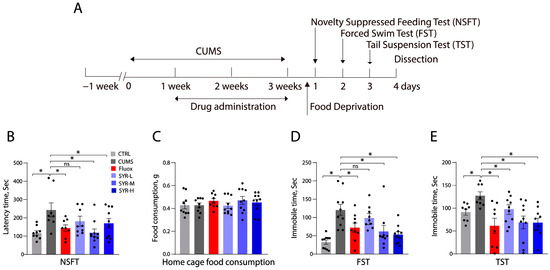 Animal behavioral tests. (A) Schematic illustration of animal behavioral test timeline. Mice were exposed to CUMS for 3 weeks, as described in Section 4. Fluoxetine (10 mg/kg) or SYR (5, 10, or 20 mg/kg) was administered (i.p.) once per day from day 7 to day 21. For the CUMS group, saline was given instead of drugs. NSFT was performed after 16–18 h food deprivation, followed by FST and TST. (B) NSFT. The latency time to food in NSFT was counted. (C) Home cage food consumption. Food consumed by individual mice in the home cage (g) within a 20 min period was measured after NSFT. (D) FST. The immobility time during a 2 to 6 min period in FST was measured. (E) TST. The immobility time during 2 to 6 min was counted. n = 8–10 mice/group. Bars represent the mean ± SEM. * p < 0.05 compared with the control or CUMS group, respectively, by one-way ANOVA followed by post hoc tests. ns, not significant.