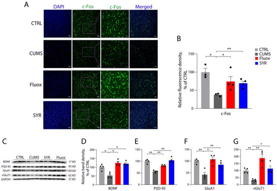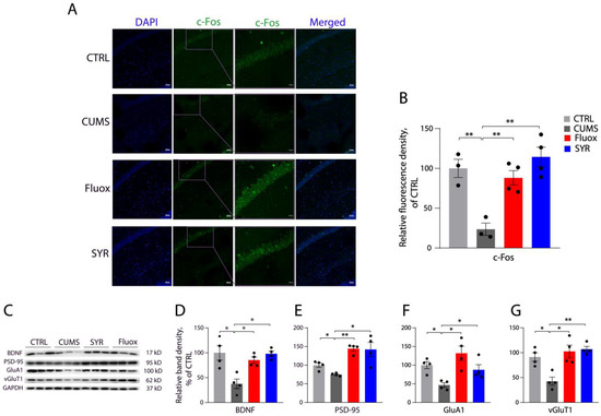We examined SYR’s effects on the expression of c-Fos, a marker of neuronal activity [38], and several synaptic proteins critical for spine synapse formation [37] in both the mPFC and hippocampus of CUMS mice. As expected, administration of fluoxetine reversed the CUMS-induced decrease in the expression of c-Fos in the mPFC in our immunohistochemistry staining assay (Figure 7A,B). By comparison, the expression of c-Fos in the mPFC of CMUS mice was also significantly elevated by the administration of SYR at the same dosage used for fluoxetine. In addition, CUMS exposure led to a reduction in the expression of several synaptic proteins in mPFC, such as BDNF, PSD-95, GluA1, and vGluT1, which could be attenuated by SYR administration (Figure 7C–G).