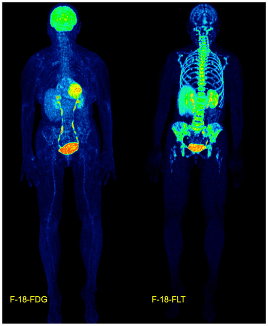 We know that [18F]FDG is related to cell viability and correlates with many tumor characteristics, such as proliferation, hypoxia, angiogenesis, apoptosis, etc. [7,8,9,10,11,12]. Attempts have been undertaken to develop dedicated tracers for tumor cell proliferation. The most promising tracer is 18F-fluorodeoxythymidine ([18F]FLT), which is transported and phosphorylated but not incorporated into DNA after phosphorylation [13]. However, [18F]FLT reflects the rate of DNA replication and is thought to be more specific than [18F]FDG because it is not taken up by cells involved in an inflammatory process. [18F]FLT has some limitations and has not found the same clinical use as [18F]FDG. One reason is the high [18F]FLT uptake in normal bone marrow and liver, which is an obstacle for the assessment of bone diseases, including hematological neoplasms such as multiple myeloma and leukemia, as well as for the assessment of liver metastases [14,15,16] (Figure 1). Another limitation is that [18F]FLT uptake is often lower than that of [18F]FDG; therefore, its sensitivity is lower than that of [18F]F-FDG, but its specificity may be higher [15]. False positive results have also been reported with [18F]FLT; e.g., this occurred due to pseudoprogression two weeks after anti-PD-1 therapy in 26 patients with advanced non-small cell lung cancer (NSCLC) [17]. Overall, the number of patient studies published to date is significantly lower than with [18F]FDG, and it is therefore unclear whether the widespread use of [18F]FLT is limited by insufficient availability or by the above-mentioned limitations. Carbon-11-labeled thymidine has been developed but is not widely used because of the short half-life of 20 min and the rapid catabolism of thymidine. Other proliferation tracers, such as [18F]FMAU or [18F]F-AraG, have found only limited use [18].