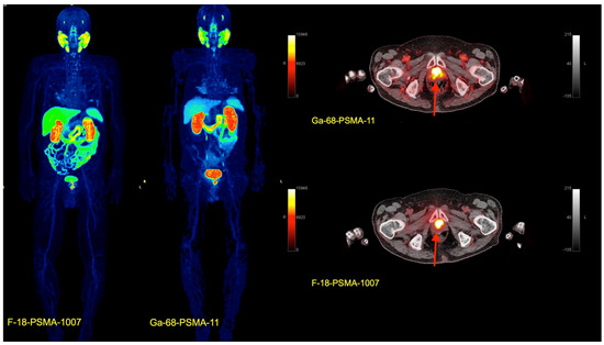 - Giesel, F.L.; Knorr, K.; Spohn, F.; Will, L.; Maurer, T.; Flechsig, P.; Neels, O.; Schiller, K.; Amarai, H.; Weber, W.A.; et al. Detection Efficacy of 18F-PSMA-1007 PET/CT in 251 Patients with Biochemical Recurrence of Prostate Cancer After Radical Prostatectomy. J. Nucl. Med. 2019, 60, 362–368. [Google Scholar] [CrossRef]