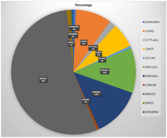 Pie chart showing the percentage of radionuclides used for labeling of different targets for PET immunoimaging.