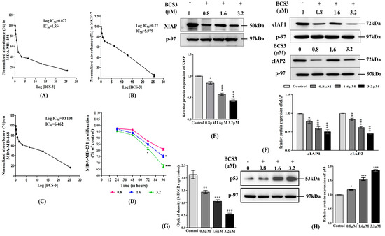 Cytotoxic effects of various concentrations of BCS3 on the proliferation of breast cancer cells, (A) MDA-MB-231, (B) MCF-7, and (C) MDA-MB-468 through MTT assay for 24 h. (D) Time-course study of proliferation of MDA-MB-231 cells after incubation with varying doses of BCS3 (0.8, 1.6, and 3.2 µM) up to 96 h. Cell viability of the DMSO vehicle control group was set at 100%. Effect of varying doses of BCS3 (0.8, 1.6, and 3.2 µM) on the relative protein expressions of inhibitory apoptotic proteins (IAPs) as quantified by western blotting analysis in MDA-MB-231 cells (E) XIAP, (F) cIAP1, and cIAP2, respectively. Respective graphs represent each band of cIAP1 and cIAP2 measured by densitometry and normalized to corresponding p-97. (G) Protein analysis of MDM2 by ELISA in MDA-MB-231 cells. (H) Relative protein expression of p53 quantified by western blotting in MDA-MB-231 cells. The respective graph represents each band of XIAP, cIAP1, cIAP2, and p53 measured by densitometry and normalized to corresponding p-97. Mean ± SEM was calculated by replicating the experiment thrice (n = 3). Significant differences are shown as * p < 0.05, ** p < 0.01, *** p < 0.001, with the control group.
