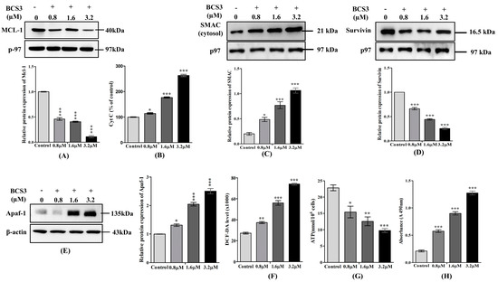 Relative protein expression of (A) MCL-1 quantified by western blotting in MDA-MB-231 cells. (B) Protein analysis of cytochrome c by ELISA in MDA-MB-231 cells. Relative protein expression of (C) SMAC, (D) Survivin, and (E) Apaf-1 quantified by western blotting in MDA-MB-231 cells. The respective graph represents each band of MCL-1, SMAC, Survivin, and Apaf-1 measured by densitometry and normalized to corresponding p-97 and β-actin. Cytotoxicity assessment through measurement of (F) ROS, (G) ATP content, and (H) lactate dehydrogenase (LDH) activity in MDA-MB-231 cells for 24 h post-treatment with varying doses of BCS3 (0.8, 1.6, and 3.2 µM). Mean ± SEM was calculated by replicating the experiment thrice (n = 3). Significant differences are shown as * p < 0.05; ** p < 0.01 and *** p < 0.001with the control group.
