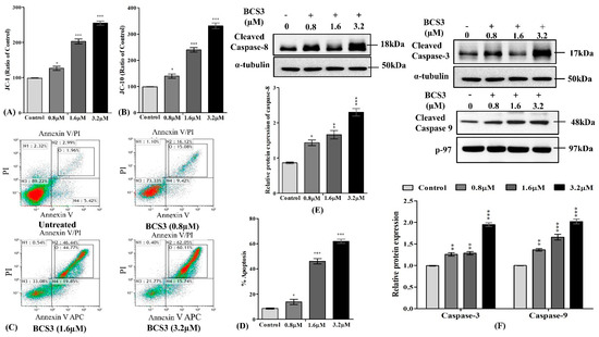 Analysis of mitochondrial membrane potential of BCS3 on MDA-MB-231 cells verified using (A) JC-1 and (B) JC-10 levels. Mean ± SEM was calculated by replicating the experiment thrice (n = 3). Significant differences are shown as * p < 0.05; ** p < 0.01 and *** p < 0.001 with the control group. (C) Determination of apoptotic cell death in MDA-MB-231 cells documented by annexin V-Alexa Fluor 647 (a647)/PI double staining and FACS analysis after treatment with BCS3 (0.8, 1.6, and 3.2 µM). Annexin V[+] and PI[−]: apoptotic cells (N4); annexin V[+] and PI[+]: Late apoptotic cells (N2); annexin V[−] and PI[+]: necrotic cells (N1) and annexin V[−] and PI[−]: Living cells (N3). (D) Bar diagram depicting the percentage of apoptosis caused by a number of early and late apoptotic cellular populations after BCS3 treatment. Representation of western blot analysis showing the protein expression of (E) cleaved caspase-8, (F) cleaved caspase-3, and cleaved caspase-9 after 72 h of treatment with BCS3 (0.8, 1.6, and 3.2 µM). Respective graphs represent each band of caspases (3 and 9) measured by densitometry and normalized to corresponding α-tubulin and p-97. Mean ± SEM was calculated by replicating the experiment thrice (n = 3). Significant differences are shown as * p < 0.05; ** p < 0.01 and *** p < 0.001 with a control group.
