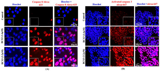 Immunofluorescence analysis depicting the elevation of (A) cleaved caspase-8 and (B) cleaved caspase-3 in vitro in MDA-MB-231 cells after 72 h of treatment with varying doses of BCS3 (1.6 and 3.2 µM) where Alexa 633 (red fluorescence) denotes caspase-3 and -8 expressions, respectively, and Hoechst (blue fluorescence) denotes cell nuclei locations. The scale bars of immunofluorescence analysis are represented as 10 µm.