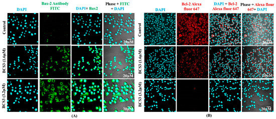 The activation of p53 caused by DNA damage led to the induction of pro-apoptotic protein transcription, Bax and Bak, and the inhibition of anti-apoptotic protein transcription, Bcl-2, Bcl-xL. The expression of Bax and Bcl-2 proteins were analyzed by immunofluorescence analysis post-treatment of MDA-MB-231 cells with BCS3. The fluorescence intensity was observed to increase with the marked enhancement of the green fluorescence color of FITC dye showing upregulation of Bax (Figure 6A). Another finding of diminished red fluorescence intensity of Alexa Fluor 647 dye was observed when MDA-MB-231 cells were treated with BCS3 dose-dependently which caused the marked downregulation of Bcl-2 protein expression (Figure 6B) causing cellular apoptosis.