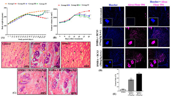 The transition of anti-breast cancer potential of BCS3 was evaluated in vivo in DMBA-treated female SD rats. Since the anatomical parameters directly correlate with physiological abnormalities, the body weight, tumor volume, and histopathological analyses were recorded to quantify the anti-cancer effect of BCS3. As the control group showed a steady and gradual increase in body weight, the DMBA-treated animals were noted with an accelerated decline in body weight after the 11th week of the study protocol. It could be a result of loss in body mass due to cancer cachexia, anorexia, and muscle weakness caused by impaired metabolism and malabsorption [49]. Remarkable improvement was noted in animal body weight upon treatment with BCS3 dose-dependently compared to the induced control group, which showed maximum protection and efficacy (Figure 8A). Subsequently, noticeable mammary tumors were observed after 14 days of the 20 mg DMBA treatment, followed by 90 days of the tumor promotion phase [50]. The tumor promotion phase was followed by a 28-day treatment period in treatment groups where significant and potent regression in tumor volume was observed post-BCS3 treatment dose-dependently, further validating its anti-tumor potential (Figure 8B).