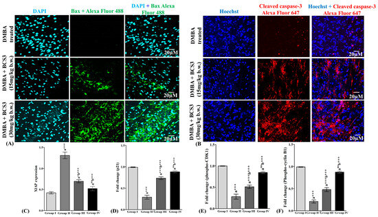 The protein expressions of Bax and cleaved caspase-3 were examined through immunofluorescence analysis on mammary tissues excised from experimental animals. DMBA-treated animals showed observably diminished levels of pro-apoptotic protein, Bax that elevated after BCS3 treatment dose-dependently as observed through green colored fluorescence (Alexa Fluor 488) (Figure 9A). Further, cytoplasmic localization of cleaved caspase-3 was observed to have reduced with the induction of mammary carcinogenesis. After BCS3 treatment, the expression was notably expanded with increased red color intensity (Alexa Fluor 647) (Figure 9B). The evident inhibition of XIAP expression in vivo was also observed through ELISA (Figure 9C). Then, the levels of cell cycle regulator proteins (p21, phosphor-CDK1, and phosphor-cyclin B1) were examined through ELISA (Figure 9D–F). The evident reduction in cell cycle protein expression post BCS3 treatment in a dose-dependent fashion was noted in accordance with previous reports that postulated the critical role of CDK1/cyclin B1 complex attenuation in arresting G2/M transition in cancer cells [28].