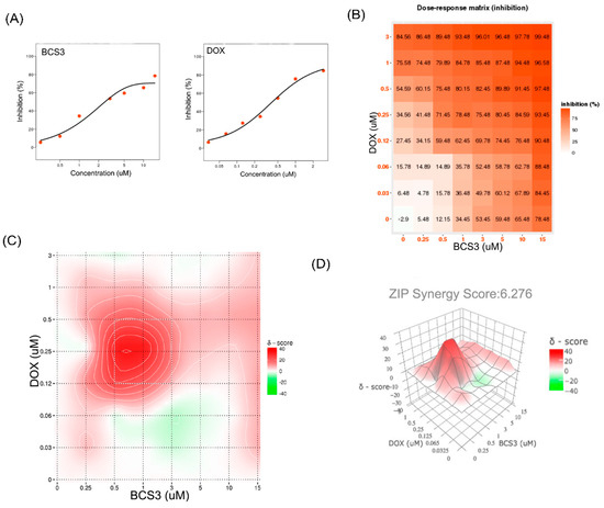 (A) Dose-inhibition response curve for BCS3 and doxorubicin output; (B) dose-response matrix (inhibition)/heat map for BCS3 and doxorubicin where the degree of red is positively related to inhibition ratio; (C) drug interaction landscape; and (D) synergy plot of combined treatment of BCS3 and doxorubicin calculated with zero interaction potency (ZIP) reference model of Synergyfinder.