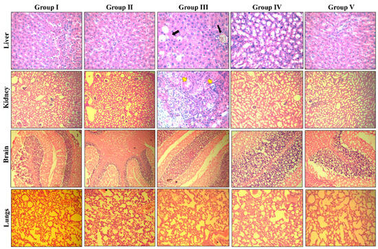 Representative photomicrograph of vital organs (liver, kidney, brain, and lungs) of normal experimental rats from repeated dose sub-acute oral toxicity study. Black arrows represent the presence of lipid droplets caused by hepatic steatosis. The kidney represents cloudy swelling (yellow arrows) and leukocytic infiltration as an effect of repeated administration of 300 mg/kg/day BCS3 dose. Group I: vehicle control group; Group II: 30 mg/kg/day of BCS3; Group III: 300 mg/kg/day of BCS3 (28 days); Group IV: satellite control group; and Group V: 300 mg/kg of BCS3 (satellite groups: 42 days); n = 5.