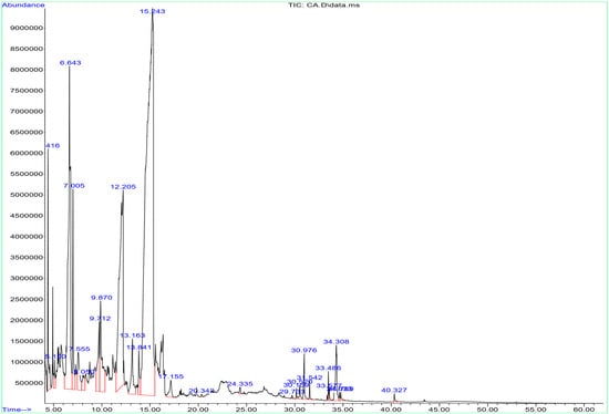 The GC-MS chromatograms of AARE. The GC-MS instrument was configured to run for 73 min with AARE for this experiment. All spectral peaks correlate with identified chemicals, with a big peak indicating the primary constituent of the extract.