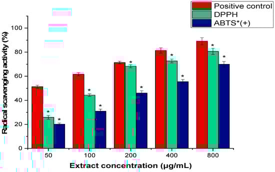 Antioxidant activity of AARE scavenging activity) at various concentrations (50–800 μg/mL). A positive control was an ascorbic acid. Three separate experiments were used to obtain the mean ± SD data. At a significance level of p < 0.05, the scavenging activity of AARE was substantially lower (*) than the positive control. + stands for radical cation.
