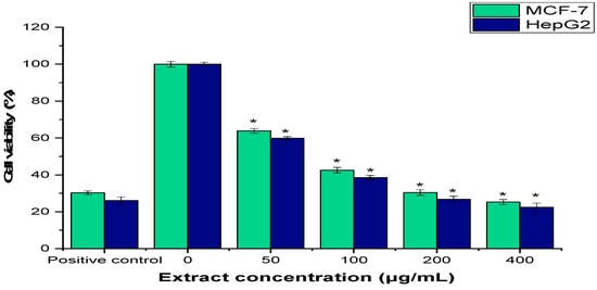 The impact of AARE on MCF-7 and HepG2 cell viability was assessed using the MTT assay. The cells were exposed to the AARE (0–400 μg/mL) for an entire day. The mean ± SD for the three different investigations is shown (* = p < 0.05 relative to the untreated cells (negative control)).