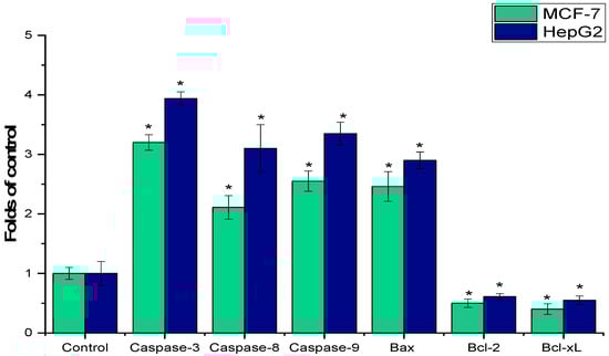 The AARE was evaluated using RT-qPCR assay to assess its effects on induced apoptotic signaling in MCF-7 and HepG2 cells. Treatment with AARE resulted in a significant downregulation of anti-apoptotic genes, and an increase in the activity of apoptotic genes (caspase-3, 8, 9, and Bax) compared to the untreated control cells (p < 0.05) (Figure 4).