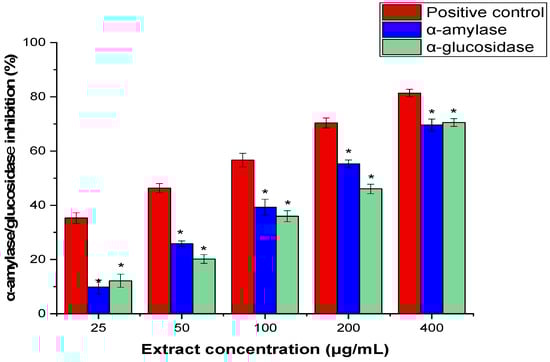 Effect of the ARE on α-Amylase and glucosidase inhibitory activities at various concentrations (25–400 μg/mL). The three independent experiments’ mean ± SD are the results (* = p < 0.05 concerning the positive control).