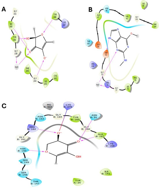 The 2D viewer of ligands interactions with the active site. (A): 2,4-Dihydroxy-2,5-dimethyl-3(2H)-furan-3-one interactions with the active site of NADPH oxidase. (B): 1H-Purin-2-amine, 6-methoxy-N-methyl- interactions with the E. coli gyrase B site active. (C): 4H-Pyran-4-one, 2,3-dihydro-3,5-dihydroxy-6-methyl- interactions with the active site of Topoisomerase IIα.
