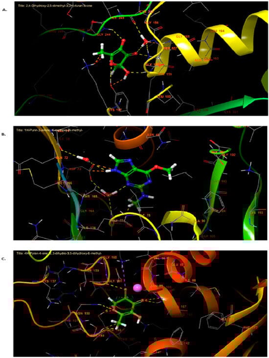 The 3D viewer of ligands interactions with the active site. (A): 2,4-Dihydroxy-2,5-dimethyl-3(2H)-furan-3-one interactions with the active site of NADPH oxidase. (B): 1H-Purin-2-amine, 6-methoxy-N-methyl- interactions with the E. coli gyrase B site active. (C): 4H-Pyran-4-one, 2,3-dihydro-3,5-dihydroxy-6-methyl- interactions with the active site of Topoisomerase IIα.