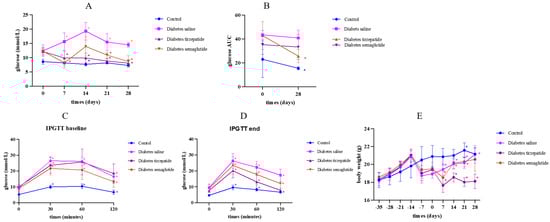 Saline-treated diabetic mice presented with high blood glucose levels through the full course of this study. Glucose levels significantly reduced after 4 weeks of semaglutide and tirzepatide (both p < 0.05) (Figure 1A). IPGTT revealed that 4 weeks of treatment with tirzepatide significantly reduced glucose AUC (p = 0.007). However, treatment with saline and semaglutide did not reduce glucose AUC significantly (p = 0.203 and p = 0.445) (Figure 1B). The 4 weeks of treatment with semaglutide and tirzepatide significantly reduced glucose excursion during IPGTT (Figure 1C,D).