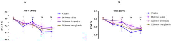 Compared with non-diabetic mice, diabetic mice exhibited higher levels of CTX and P1NP before treatment. At week 4, P1NP levels reduced in all diabetic mice and non-diabetic mice. The levels of P1NP in the semaglutide-treated group at week 1, and in the tirzepatide-treated group at week 1 and week 2 did not reduce significantly. However, the change in CTX and P1NP levels were similar to the change that was observed in saline-treated diabetic mice during 4 weeks of treatment (all p > 0.05) (Figure 2).