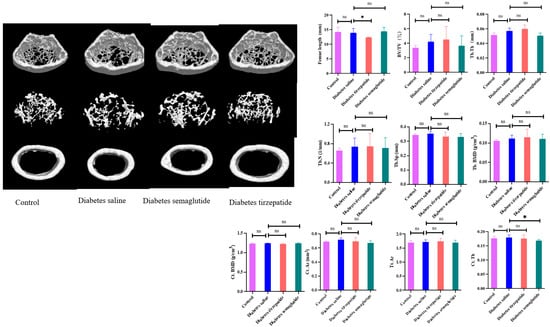 Compared to saline-treated diabetic mice, the mean femur length was shorter in the tirzepatide group (Figure 3). There were no significant differences in femur lengths between the saline group and the semaglutide group, or the non-diabetic group and the saline group. We examined the effects of semaglutide and tirzepatide on the cortical and trabecular bone microarchitectures of the femur. The BV/TV, Tb.BMD, Tb.Th, Tb.Sp, Tb.N, Ct.BMD, Ct.Ar, and Tt.Ar were similar in non-diabetic mice and saline-treated diabetic mice (all p > 0.05). After treatment with tirzepatide or semaglutide, cortical bone and trabecular bone parameters did not change significantly compared to saline-treated diabetic mice, except that Ct.Th was lower in the semaglutide group (p = 0.032).